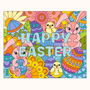 Surrounding the bold “Happy Easter” lettering is a busy little world of bunnies, chicks, patterned eggs, flowers and Huetangle-style shapes, ready for you to bring to life.