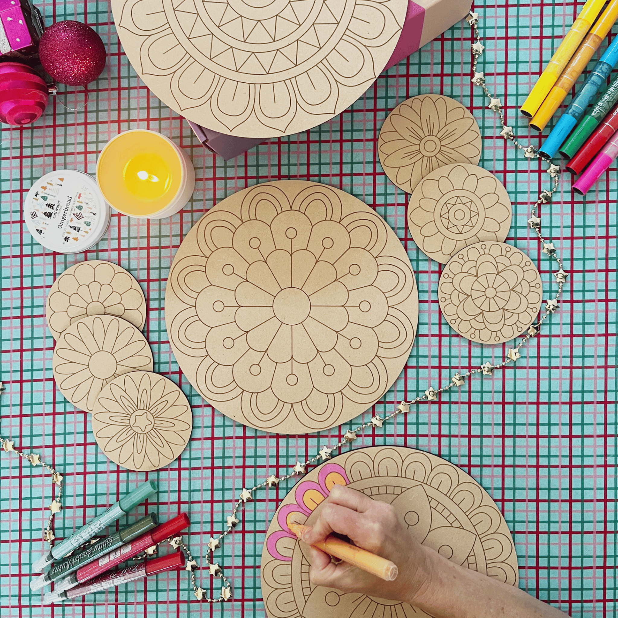 Inside you’ll find three new Hueray Floral Mandala Art Boards, six new Hueray Floral Coasters, and a beautifully scented, hand-poured Saltwater Lifestyle soy candle to elevate your creative ritual.